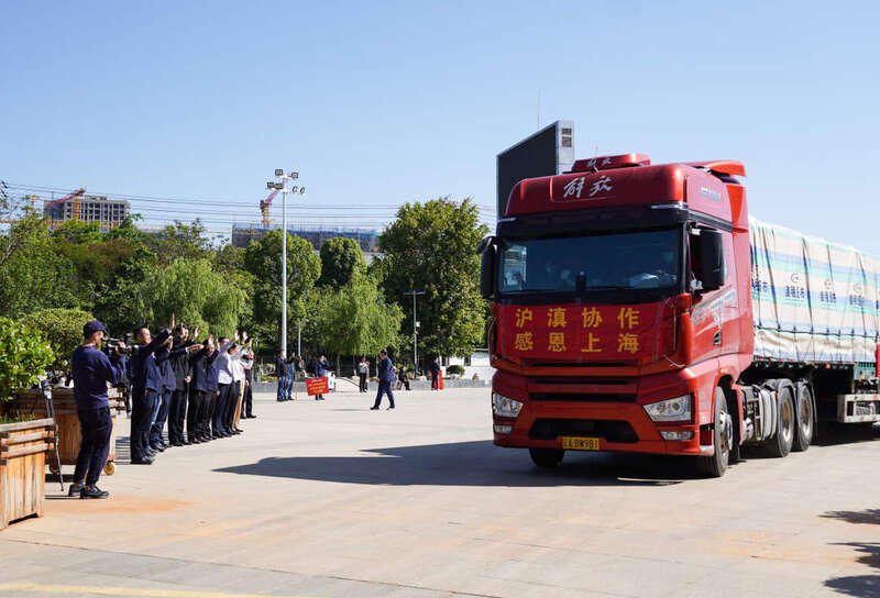 4月23日早上10:00,云南大理州援沪物资发车仪式在祥云举行,六辆满载生活物资的重型卡车带着白州人民的深切挂念驶往上海。