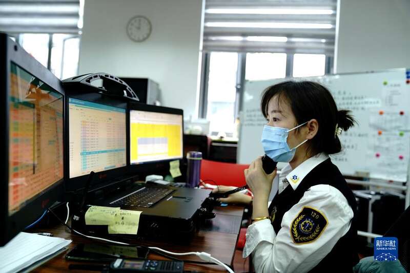 4月23日,上海市闵行区医疗急救中心调度员在接听电话。