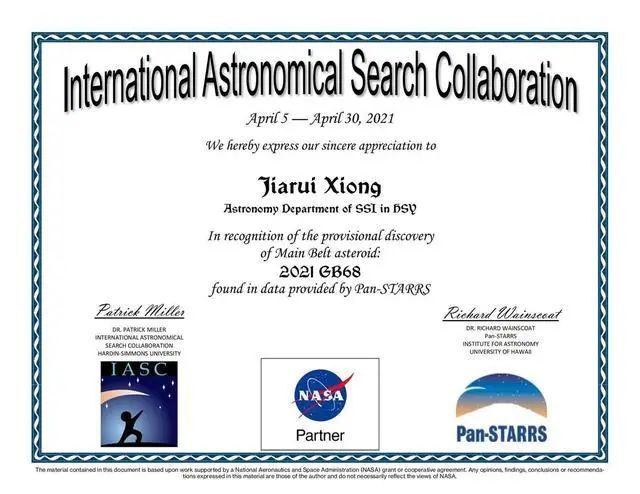 熊家锐小组将拥有此小行星的命名权。
