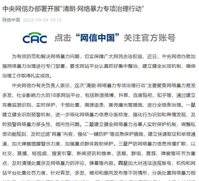 中央网信办有关负责人表示,这次“清朗·网络暴力专项治理行动”主要聚焦网络暴力易发多发、社会影响力大的18家网站平台,包括新浪微博、抖音、百度贴吧、知乎等,通过建立完善监测识别、实时保护、干预处置、溯源追责、宣传曝光等措施,进行全链条治理。一是建立健全识别预警机制,进一步细化网络暴力信息分类标准,强化行为识别和舆情发现,及时预警网络暴力苗头性、倾向性问题。二是建立健全网络暴力当事人实时保护机制,调整私信功能规则,及时过滤“网暴”内容,强化“一键防护”等应急保护措施,建立快速取证和举报通道,加大弹窗提醒警示力度,加强重点群体救助保护。三是严防网络暴力信息传播扩散,以社交、直播、短视频、搜索引擎、新闻资讯和榜单、话题、群组、推荐、弹窗等环节为重点,及时清理处置涉及网络暴力的评论、弹幕等内容。四是加大对违法违规账号、机构和网站平台处置处罚力度,针对首发、多发、煽动和跟风发布等不同情形,分类处置网络暴力相关账号,连带处置违规账号背后MCN机构,严肃问责处罚失职失责网站平台,会同有关部门依法追究相关人员法律责任。五是强化警示曝光和正向引导,及时公布典型案例处置情况,推动权威机构和专业人士友善评论、理性发声。