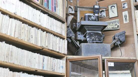 步入书店的刹那,仿佛时空穿越:1956年泛黄的海报、边缘布满灰尘的蓝色吊扇、上世纪七八十年代的缝纫机……旧书的味道弥漫,不足30平方米的空间里放眼望去皆是书,大多按照年代划分摆放,古籍、1990年前的书、1990年后的书。