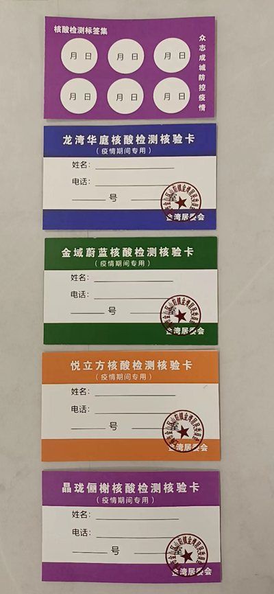 在疫情初期居民凭核酸检测记录出入小区的阶段,陈锋亲手设计了“小区居民核酸检测登记卡”,名片大小的卡片正面填写居民基础信息,背面设计了核酸检测记录敲章位置,居民每做一次核酸记录,就可以让工作人员核实敲章,最近做了几次核酸?什么时候做的?通过小卡片就能一目了然。