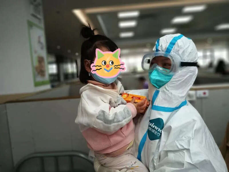 人民网上海4月25日电 (唐小丽、印沁沁)“我来抓你咯!”在亲子舱里,全副武装的“大白”正在和四五个患儿玩老鹰抓小鸡的游戏。“大白”扮演母鸡,患儿扮演小鸡,当“大白”跑起来时,孩子们发出了欢快的笑声。