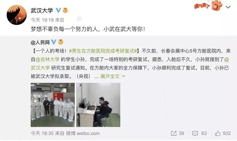 而在方舱里收到录取的通知
