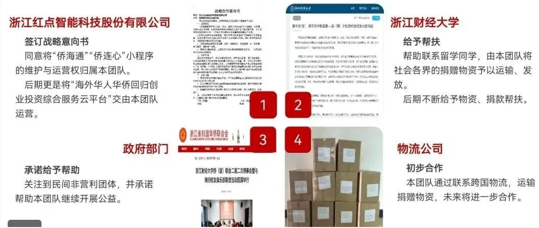 成立之初,侨帮团面临着经费短缺、资源匮乏、与国际物流公司合作困难等种种问题。在浙江财经大学数据科学学院李云霞老师的牵头下,团队与浙江红点智能科技股份有限公司、浙江省归国华侨联合会、跨国物流公司等单位进行合作沟通,形成“一方联系,三方联动”的机制:侨帮团作为“中间组织”,通过“侨海通”和“侨连心”小程序,串联起爱心企业、侨胞组织和政府三方的组织。企业通过搭建“侨海通”小程序,为收集侨胞信息和诉求,在收到社会各界爱心人士在疫情之下的捐赠意愿后,侨帮团就会帮助整理信息和物资资源,在政府尤其是浙江省归国华人华侨联会的帮助下,将整个社会捐赠形成串联作用,实现点对点的高效物资帮扶。