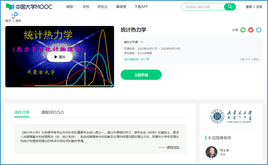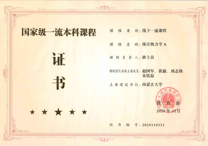 教学实践证明,采用“统计热力学”这一创新体系组织热统教学是完全可行的,其效果令人欣慰。内蒙古大学热物理教学团队经二十余年的探索为此新体系先后出版了“十一五”“十二五”国家级规划教材,并相继出版了配套的“电子教案”和“学习辅导”(见图3)。《统计热力学》2004年获国家级精品课程,2013年获国家级精品资源共享课,2014年获国家教学成果二等奖,2018年转型升级为中国大学MOOC在线课程(图4),2020年获批国家一流本科课程(见图5)。
