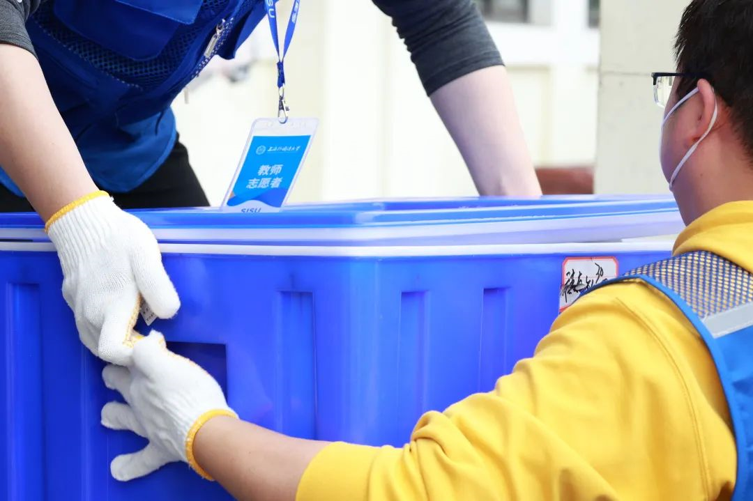 自3月2日起的40多天里,我曾在清晨走进食堂拆奶箱、打包餐食,听着食堂的工作人员此起彼伏的“又一盆鸡蛋打包完了,下一盆!”“速度要加快了,等下学生要饿肚子了!”他们不仅备餐勤快利落,在核酸检测时也总是脚步急匆匆,嘴上挂着一句“我赶着做、回去还要烧饭”。教职工们换洗衣服不够了,就一起穿起SISU T恤,拥有上外蓝的专属标记。