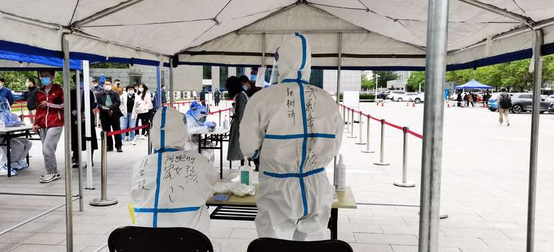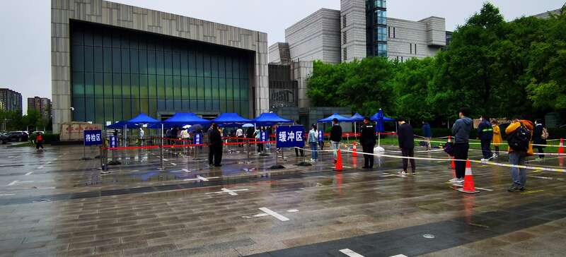 4月27日早上,北京下起了雨。因为下了雨,人们来检测的时间更加分散。裴宇感觉,“这次比上次更迅速了”。经过首轮检测,工作人员扫描身份证和护照的速度更快,平均不到10秒就能完成一次身份录入。前来检测的市民和外籍人员也都记得要带相关证件,让整个检测流程运转得更为迅速。