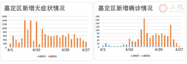 嘉定区疫情呈明显下降趋势,确诊病例连续4天下降,相比于4月24日,降幅达到90%,且连续3天闭环外确诊病例为0。无症状感染病例数也连续4天下降,并且在从4月26日起,无症状患者皆于闭环管控内。