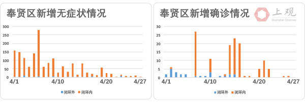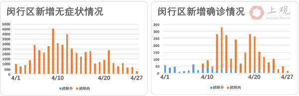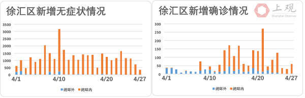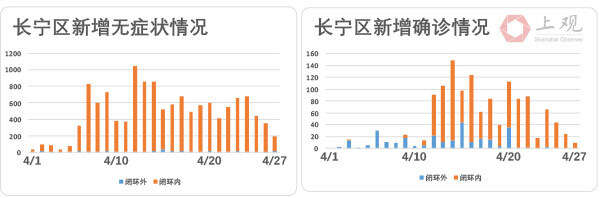 徐汇区无症状感染者数也不断下降,相比4月23日,27日新增病例数降幅达到79.1%。