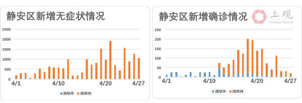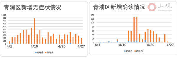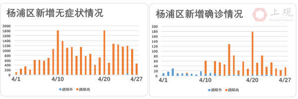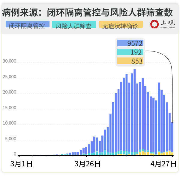 4月27日,在上海新增的1292例确诊病例中,432例为闭环内确诊,仅有2例病例是在闭环外确诊,占比仅为0.155%。而剩余858人为此前无症状患者转为确诊病例。