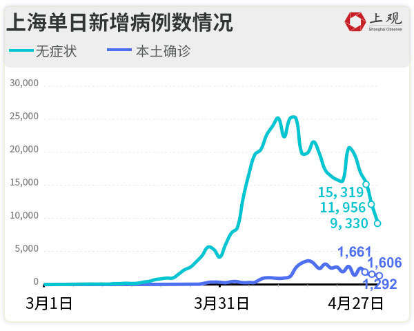 4月27日,上海单日新增确诊病例1292例,新增无症状感染者9330例。这是自4月1日以来,上海无症状感染者新增数量首次降至1万例以下。