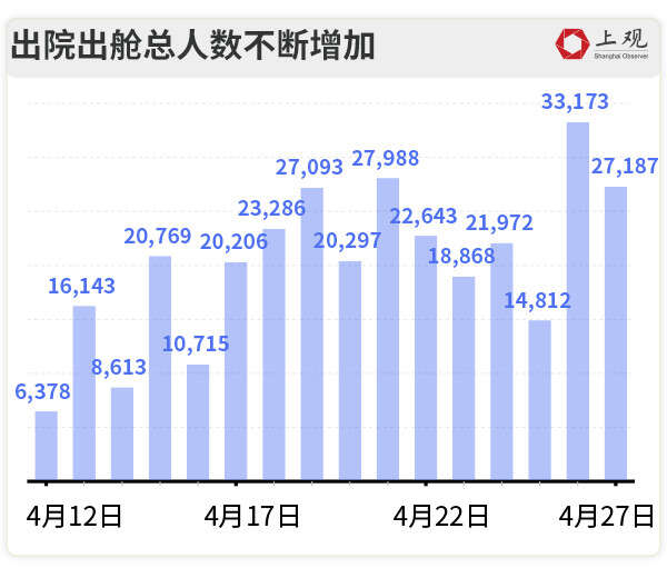 从4月18日起,当日出院出舱总人数已超过当日新增病例数,4月26日,出院出舱总人数达到33173人,比当日新增人数多出19611人。