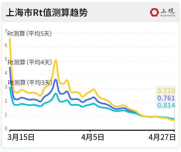 上海本轮疫情的Rt值(4天平均值)已降至0.76,已低于1。