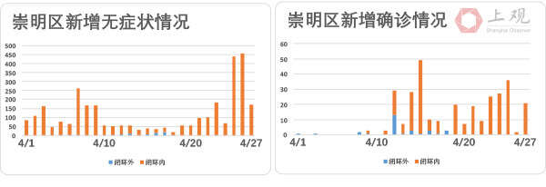 崇明区确诊病例从4月19日起实现社会层面清零,此后病例皆于闭环管控内确诊;而无症状感染者则在4月23日时出现1例于闭环外,其余也都在隔离管控内。