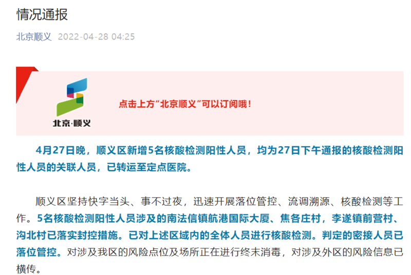 4月27日晚,顺义区新增5名核酸检测阳性人员,均为27日下午通报的核酸检测阳性人员的关联人员,已转运至定点医院。