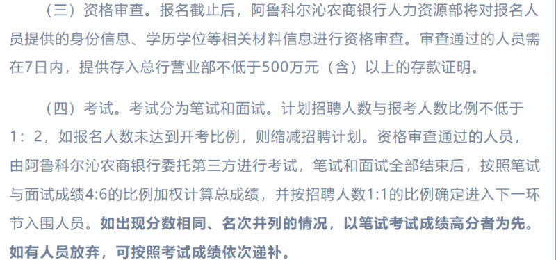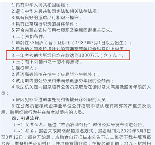 今年3月18日,阿鲁科尔沁农商银行面向社会公开引进资源型人才2人,公告称“报名截止后,阿鲁科尔沁农商银行人力资源部将对报名人员提供的身份信息、学历学位等相关材料信息进行资格审查。审查通过的人员需在7日内,提供存入总行营业部不低于500万元(含)以上的存款证明。”