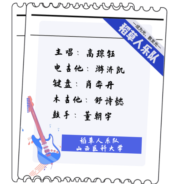 在占据大学生涯四分之三的青春里,他们从陌生人变成了朝夕相处的朋友, 从一群初次共同演奏的小白,成长为一支越来越成熟的乐队。 “音乐能够让我缓解学习中的压力,而稻草人乐队让我在放松自己的同时,更发现了音乐的乐趣。加入乐队是我做的最有意义的一件事。”木吉他手舒诗懿讲道。