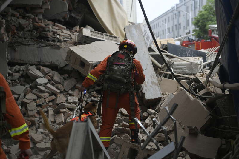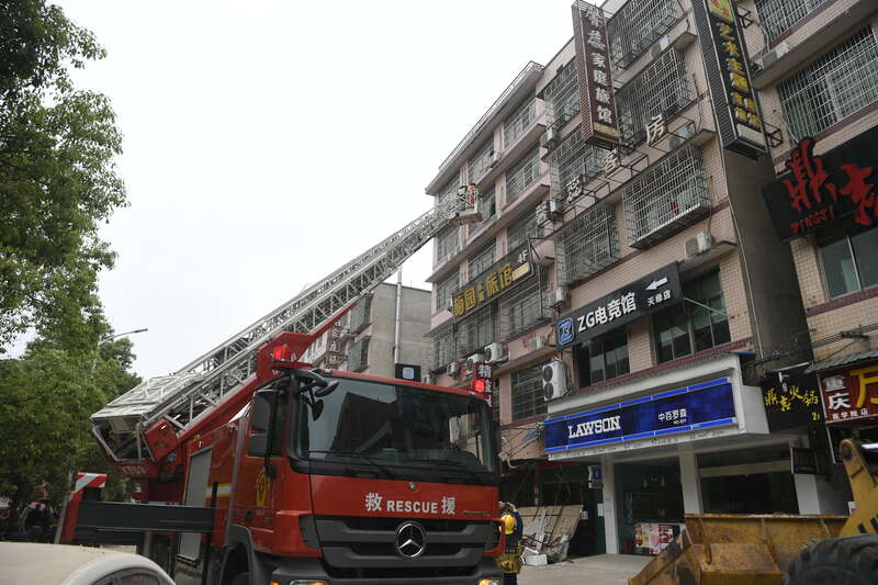 消防人员对紧邻垮塌建筑内部的人员进行紧急疏散。