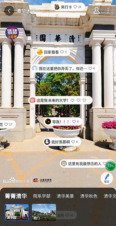 又如百度地图有一个全景地图功能,且支持在虚拟场景中打卡留言。于是,用户纷纷自发在一些城市文化地标进行“云打卡”。比如,在清华大学老校门,我们不仅能读到各种故地重游的感慨,也能看到许多面向未来的向往。这些跨越时空的打卡和交流,表达的是人们对该地点的观感和浮想,承载的是人与城在情感和意义上的深刻关联。