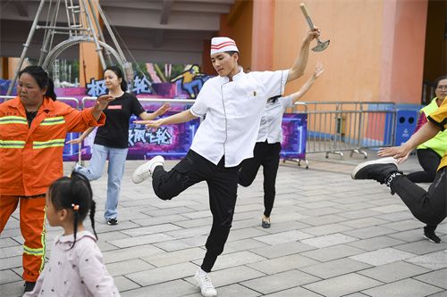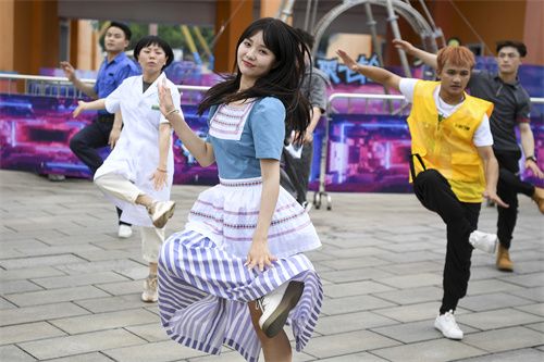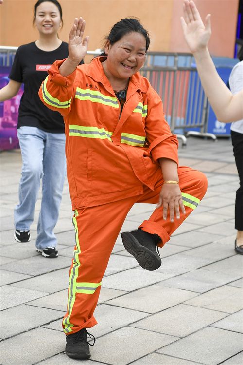 2022年4月28日,长沙,市民欢跳毽子操。当日,全民欢跳毽子操运动在长沙世界之窗上演,医生、环卫、外卖员、厨师、保安等各行业一线岗位劳动者代表纷纷参与其中,用这种集体健身的方式迎接“五一”国际劳动节。 中新社记者 杨华峰 摄
