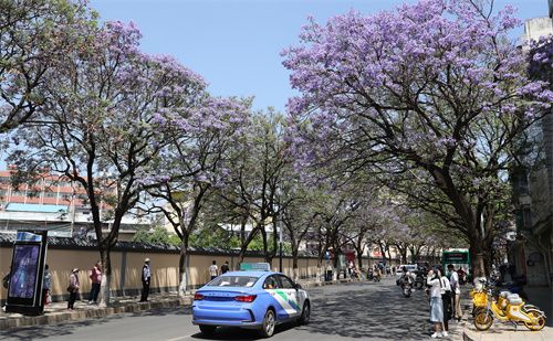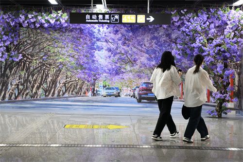 2022年4月28日,市民在昆明地铁苏家塘站拍摄“蓝花楹”仿真花卉布景。近日,“蓝花楹”仿真花卉布景亮相昆明地铁4号线苏家塘站站厅,成为一道靓丽风景。
