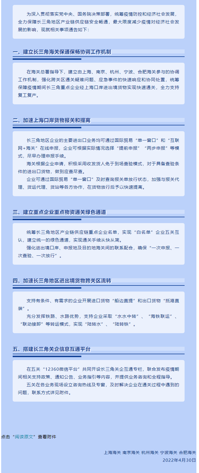 4月30日,长三角地区上海、南京、杭州、宁波、合肥5家直属海关发布联合通告,统筹疫情防控和经济社会发展,全力保障长三角地区产业链供应链安全畅通,最大限度减少疫情对经济社会发展的影响。具体措施包括: