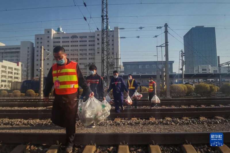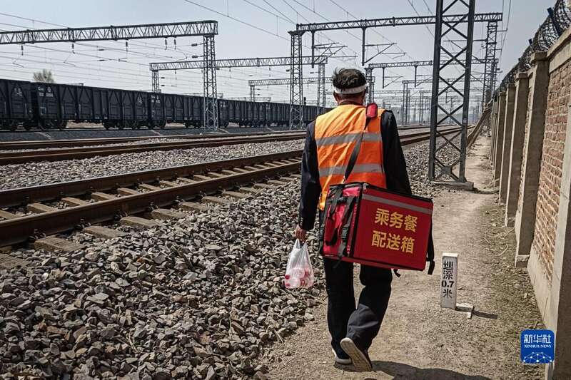 4月17日,锦州市大虎山站助理值班员贾志强步行为机车乘务员送餐。