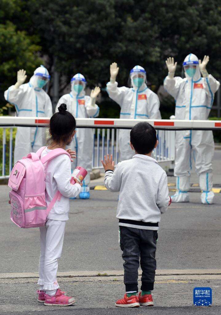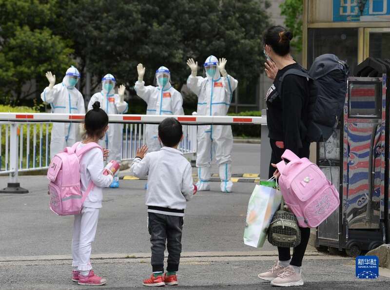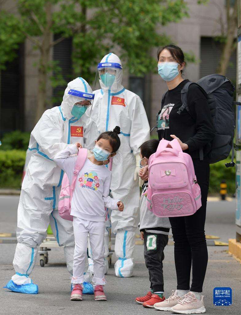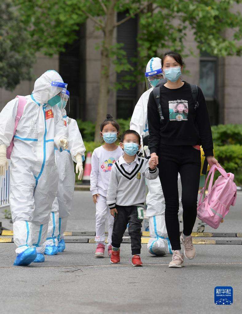 4月30日,在医护人员的陪伴下,妈妈领着小华(前中)和姐姐(后中)从上海交通大学医学院附属仁济医院南部院区的收治点内走出,准备回家。