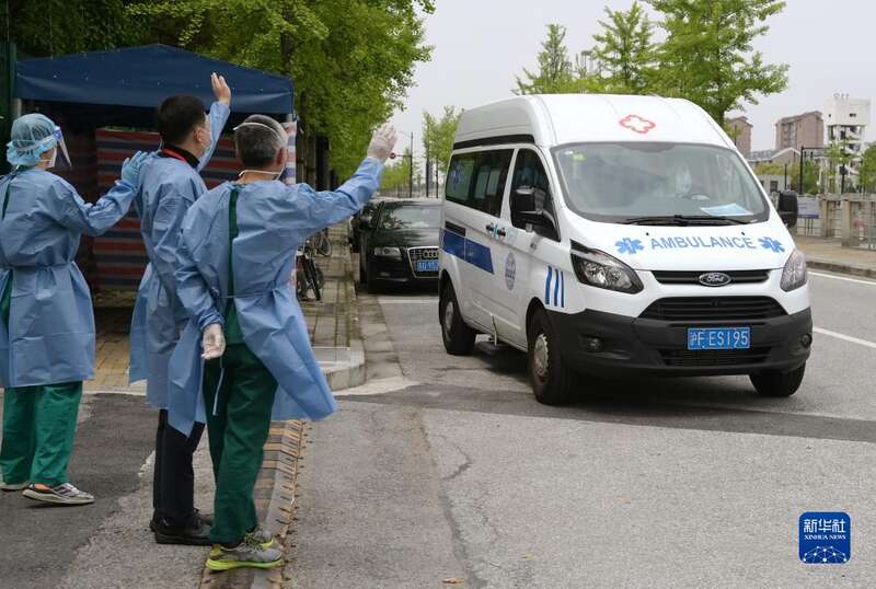4月30日,医护人员在医院出口向乘车返家的三人挥手道别。