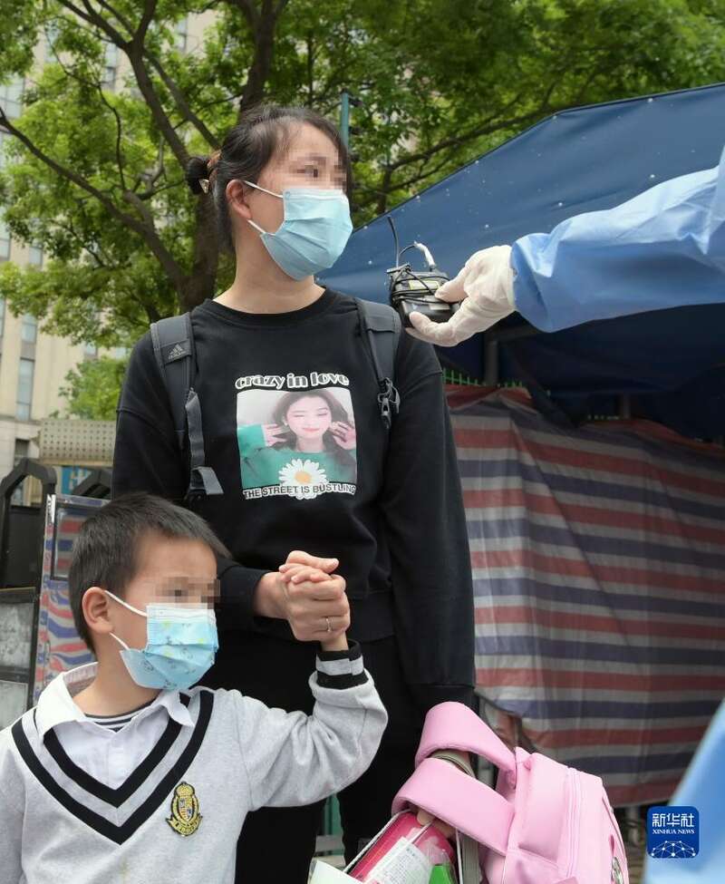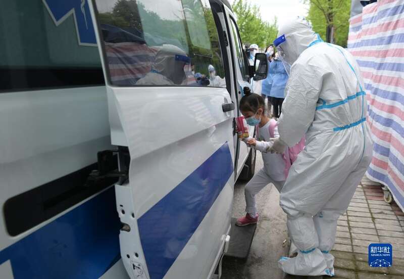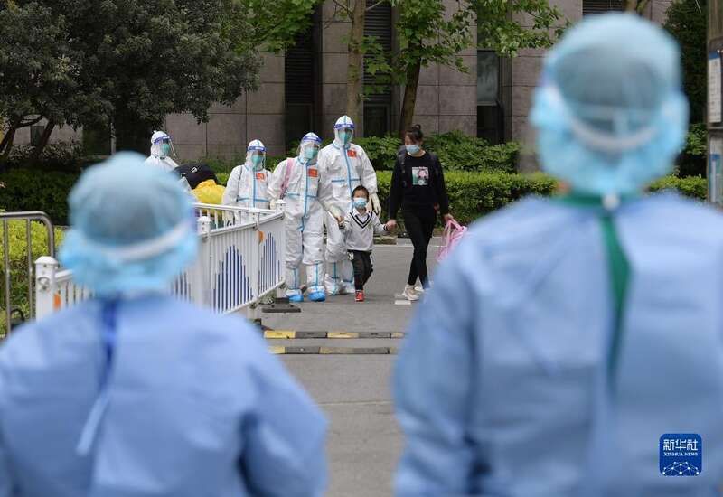 4月30日,在医护人员的陪伴下,妈妈领着小华(中)从上海交通大学医学院附属仁济医院南部院区的收治点内走出。