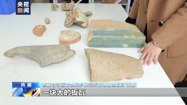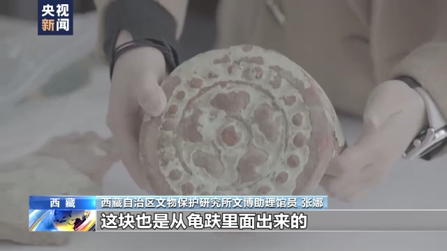 西藏自治区文物保护研究所文博助理馆员 张娜:这个瓦当的话是挖掘出来最完整的一个,这一块也是从龟趺里面出来的一块大的板瓦,这是我们这次出土最大的板瓦。