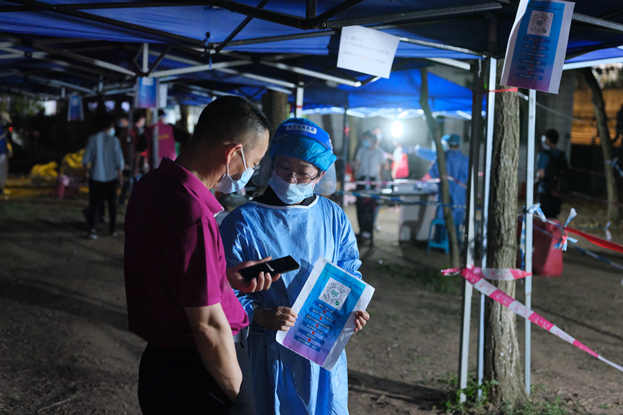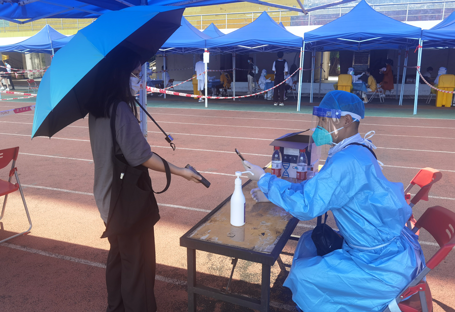 3分队的陈玉玲和罗琭昕每每穿上防护服,一站几个小时后,除了收获闷热感、劳累感,收获更多的是幸福感:“当帮助老人家完成了自己第一次检测申请得到夸赞时,当带领长者通过快速通道测完核酸被感谢时,当看到校园平安无事正常运转时,我们都感受到助人为乐的满满幸福感。”