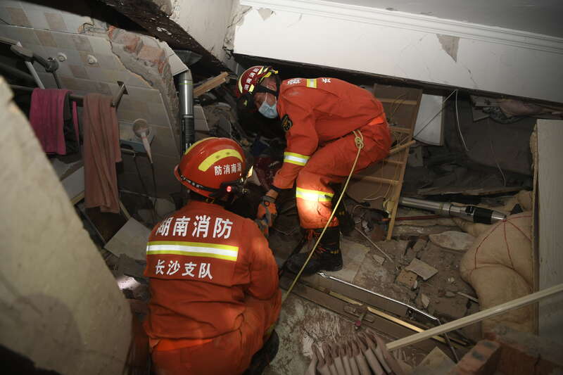 图为倒塌现场,消防战士设法救出被困人员。湖南消防供图