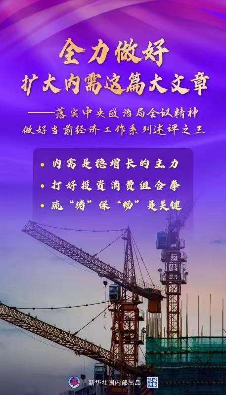 抓好基础设施建设投资,积极扩大有效投资,做大做强国内市场,培育更多新的消费增长点,全力做好扩大内需这篇大文章,将为中国经济稳中求进提供更强劲更持久动力。