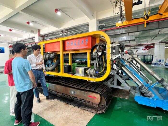采访过程中,毛竞航还向记者介绍了他们团队的研发成果“开拓一号”。“这是一台针对深海锰结核(矿石)的采矿车,长5.6米、宽3米、高2.1米,重量8.7吨,锰结核(矿石的形状)类似土豆,附着在海底沉积物里面,这台设备就可以通过水利的方式将锰结核矿石吸到我们的集矿舱,它的深度和智能控制达到了国内领先水平。我们都叫它‘深海矿工’,是我们研究院自主研发的深海重载作业采矿车。”聊起“开拓者一号”,毛竞航侃侃而谈,神情里满是骄傲与自豪。