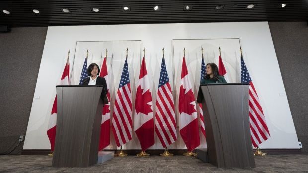 当地时间5月5日,美国贸易代表戴琪在渥太华会晤加拿大贸易部长伍凤仪(Mary Ng),并随后举行联合新闻发布会。