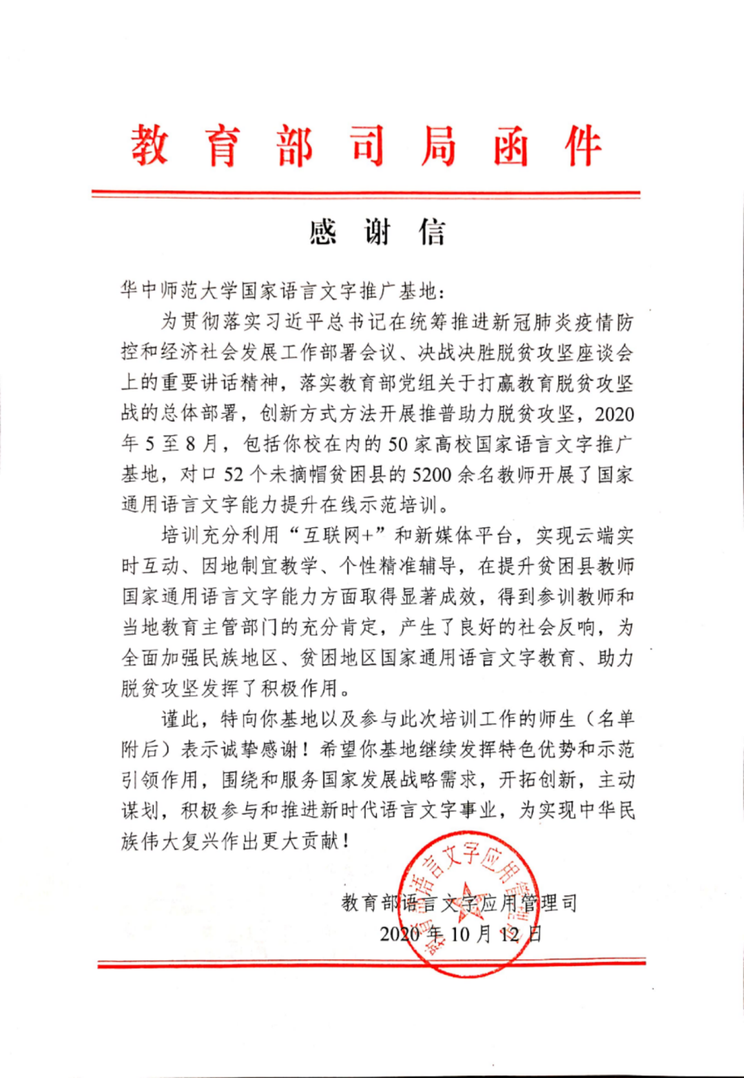 华中师范大学国家语言文字推广基地承担了对口凉山昭觉县开展“教师国家通用语言文字能力提升在线示范培训”(“普通话培训”)项目,项目组依托学校师资优势,组建30人的培训团队,对该县100名彝族农村教师,每人进行60学时以上的普通话远程在线培训。培训内容包括“普通话语音训练、教师口语表达训练、中国传统文化学习”等三个板块。培训充分利用“互联网+”和新媒体平台,实现云端实时互动、因地制宜教学、个性精准辅导,在提升贫困县教师国家通用语言文字能力方面取得显著成效,得到参训教师和当地教育主管部门的充分肯定,产生了良好的社会反响,为全面加强民族地区、贫困地区国家通用语言文字教育、助力脱贫攻坚发挥了积极作用。