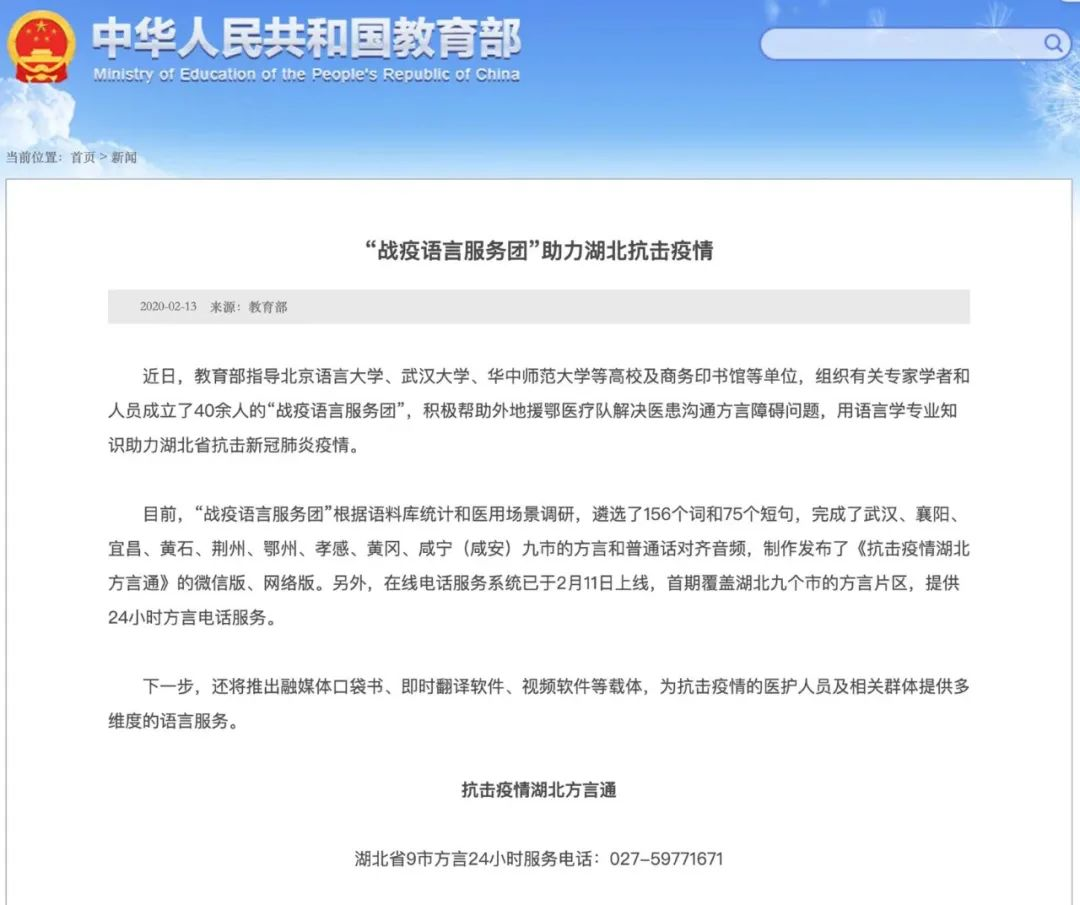 在国家语委的指导下,华中师范大学语言与语言教育研究中心,迅速加入“战疫语言服务团”,和其他多家单位联合攻关,突击研制并发布了《抗击疫情湖北方言通》,还先后推出网络版、微信版和抖音版,为医护人员提供了便捷多样的语言服务,有效缓解了医患沟通的障碍,深受好评。这不仅彰显了中国语言文学一流学科的社会责任与社会服务能力,也彰显了学校与武汉、湖北休戚相关、风雨同舟的共同体意识。“战疫语言服务团”的相关工作,得到了《人民日报》《光明日报》《中国青年报》《中国日报》、教育部官方网站等媒体报道,产生了良好的社会反响。