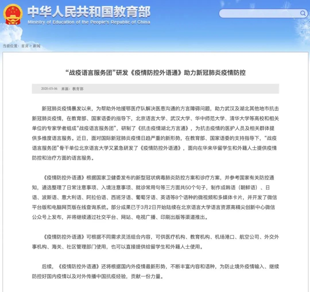 在2020年武汉突发新冠肺炎疫情时,我校在教育部语信司的指导下,与北京语言大学、武汉大学等高校和商务印书馆等单位迅速成立了“战疫语言服务团”,突击研制了《抗击疫情湖北方言通》,为消除医患之间的沟通障碍发挥了重要作用。