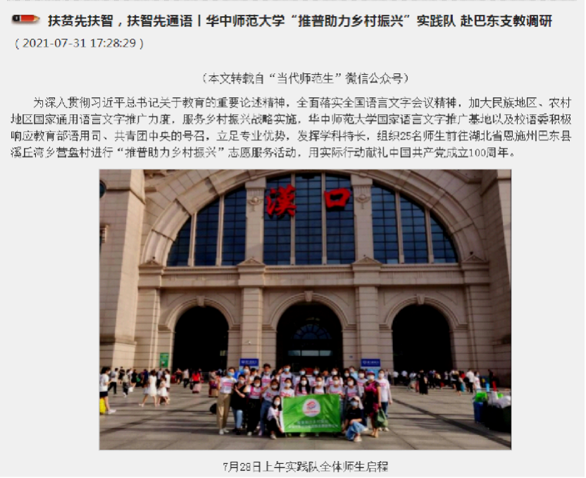 为全面落实全国语言文字会议精神,加大民族地区、农村地区国家通用语言文字推广力度,服务乡村振兴战略实施,华中师范大学国家语言文字推广基地组织了25名师生,于2021年7月下旬前往湖北省恩施州巴东县溪丘湾乡营盘村,进行为期一周的“推普助力乡村振兴”志愿服务活动,通过富有针对性的教学,切实帮助乡村地区的学生增强学说普通话的意识,提高普通话水平,收到良好效果,用实际行动庆祝中国共产党成立100周年。