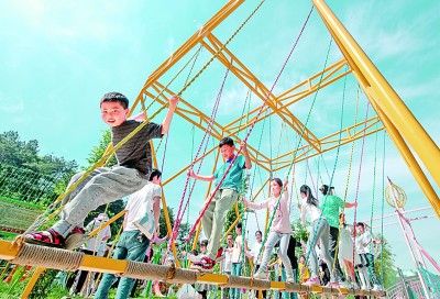 湖南株洲茶陵县的茶乡花海,一群小孩子正在欢快地荡秋千。胡艳波摄/光明图片