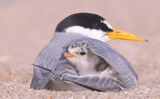当地时间2018年6月12日,美国新泽西,一只小燕鸥从妈妈的翅膀下面探出头来,燕鸥妈妈带着孩子在泽西海滩休息的时候被摄影师抓拍到了这温馨、俏皮的一幕。(来源:视觉中国)