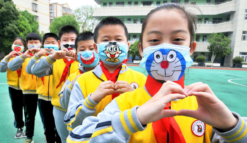2020年5月7日,在江苏淮安市实验小学(新城校区),学生们在“特别的微笑 榜样的力量”主题绘画活动中展示在口罩上绘制的笑脸。