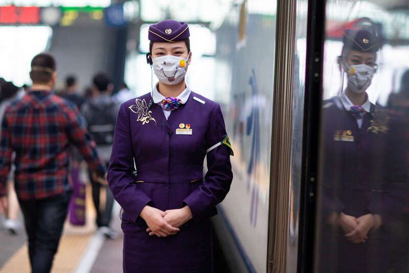 2020年5月8日,在南京火车站站台上,一名列车员戴着“笑脸口罩”迎接旅客上车。