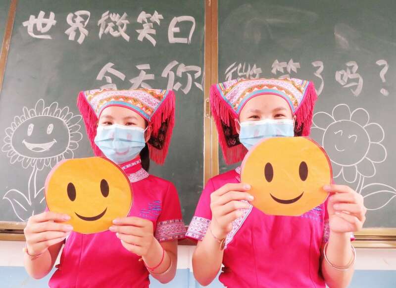 2020年5月8日,在湖南省江永县兰溪瑶族乡学校六年级一班,一对双胞胎姐妹在展示自制的笑脸卡。