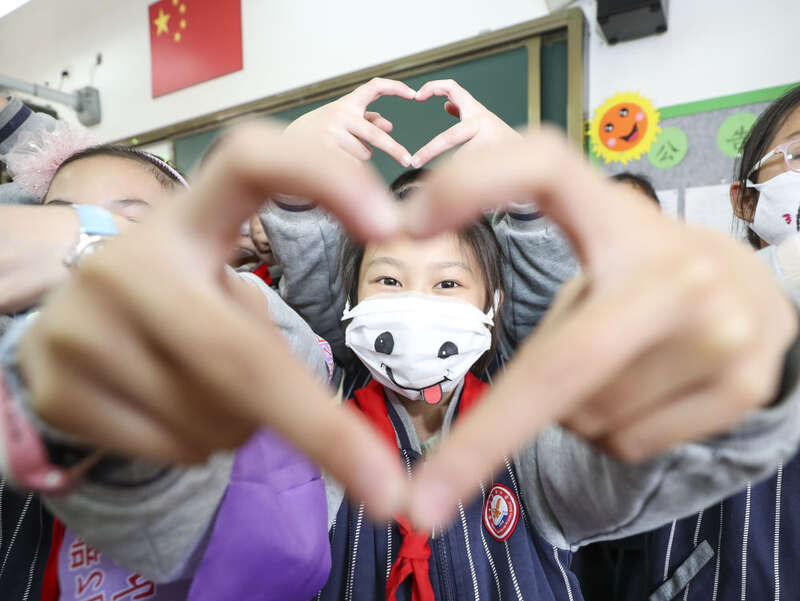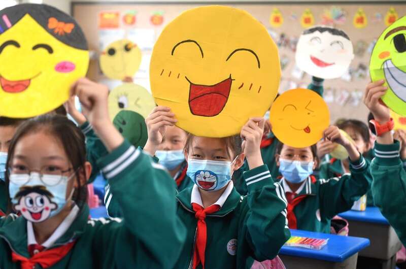 2021年5月8日,石家庄市桥西区西岗头小学学生手举笑脸卡做游戏。