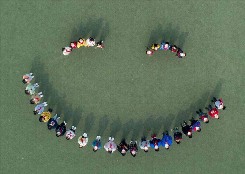 2020年5月8日,安徽省安庆市迎江区华中路第二小学在操场上开展手绘“微笑口罩”创意活动,