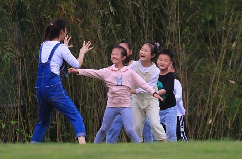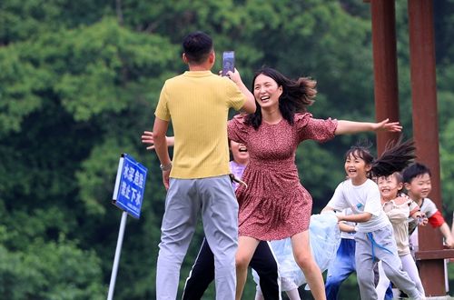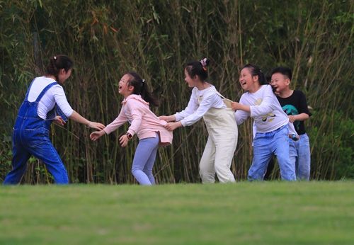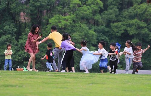 2022年5月8日,在江西省吉安市泰和县蜀口生态岛景区,游客正在玩老鹰抓小鸡民间游戏,开怀大笑乐在其中。