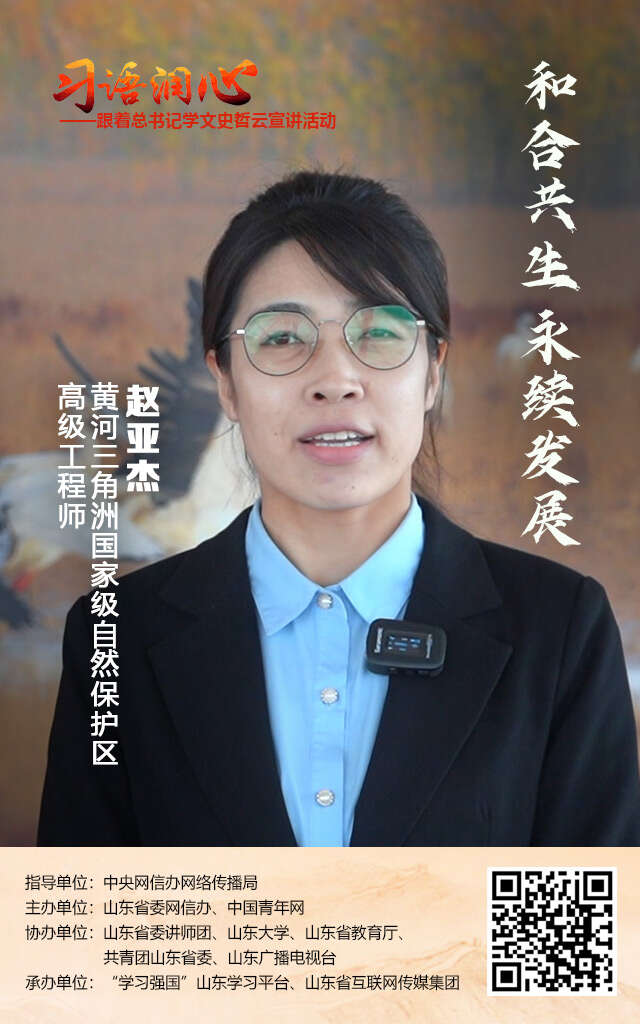为喜迎党的二十大胜利召开,推动党史学习教育常态化长效化,激发广大网民特别是青年群体深刻理解“两个确立”的决定性意义,增强“两个维护”的自觉性、坚定性,5月9日,在习近平总书记给《文史哲》编辑部全体编辑人员回信一周年之际,“习语润心——跟着总书记学文史哲”云宣讲活动正式启动。活动由中央网信办网络传播局指导,山东省委网信办、中国青年网主办,山东省委讲师团、山东大学、山东省教育厅、共青团山东省委、山东广播电视台协办,“学习强国”山东学习平台、山东省互联网传媒集团承办。今天,让我们跟随镜头来到黄河入海口“鸟类国际机场”,听山东黄河三角洲国家级自然保护区高级工程师赵亚杰为我们讲述人与鸟的生态故事。